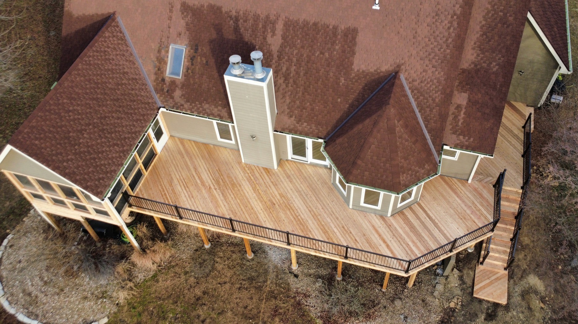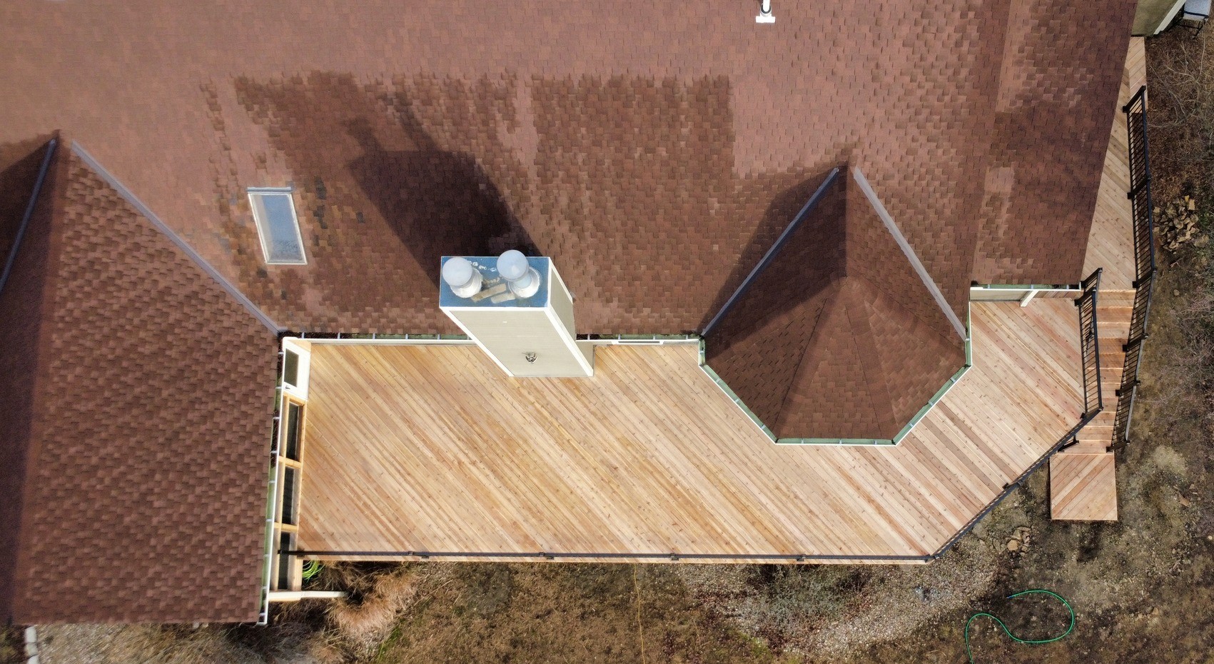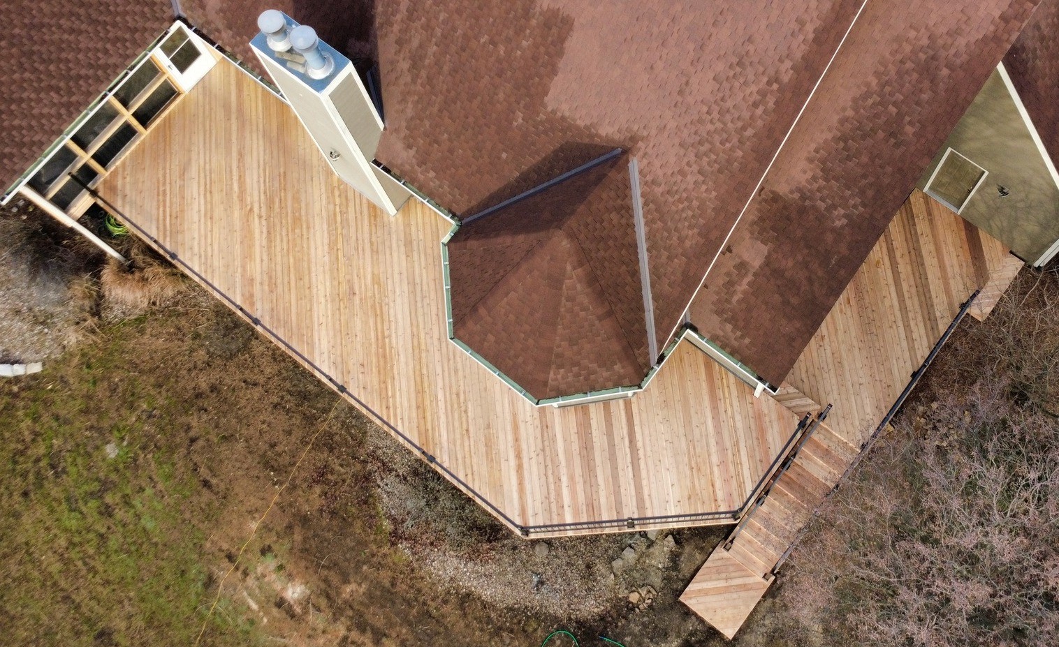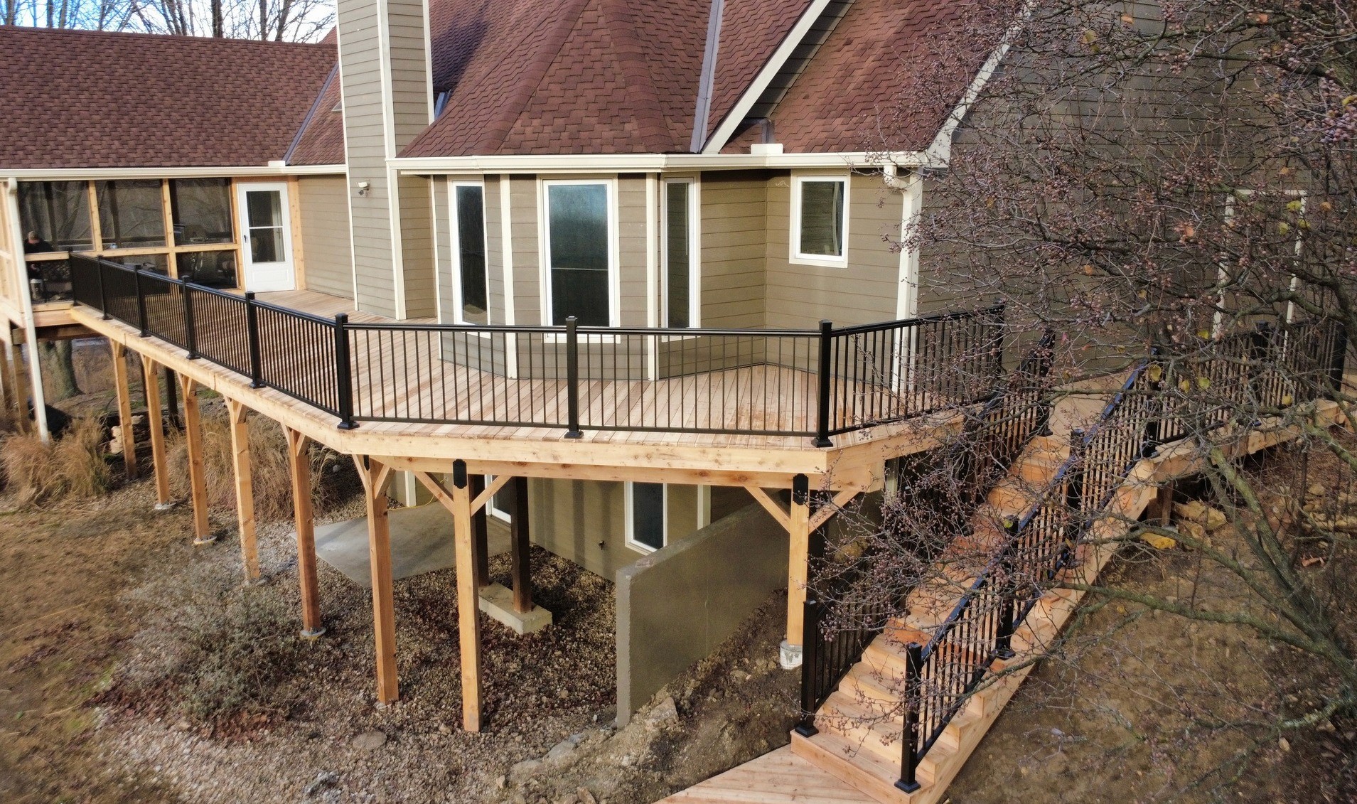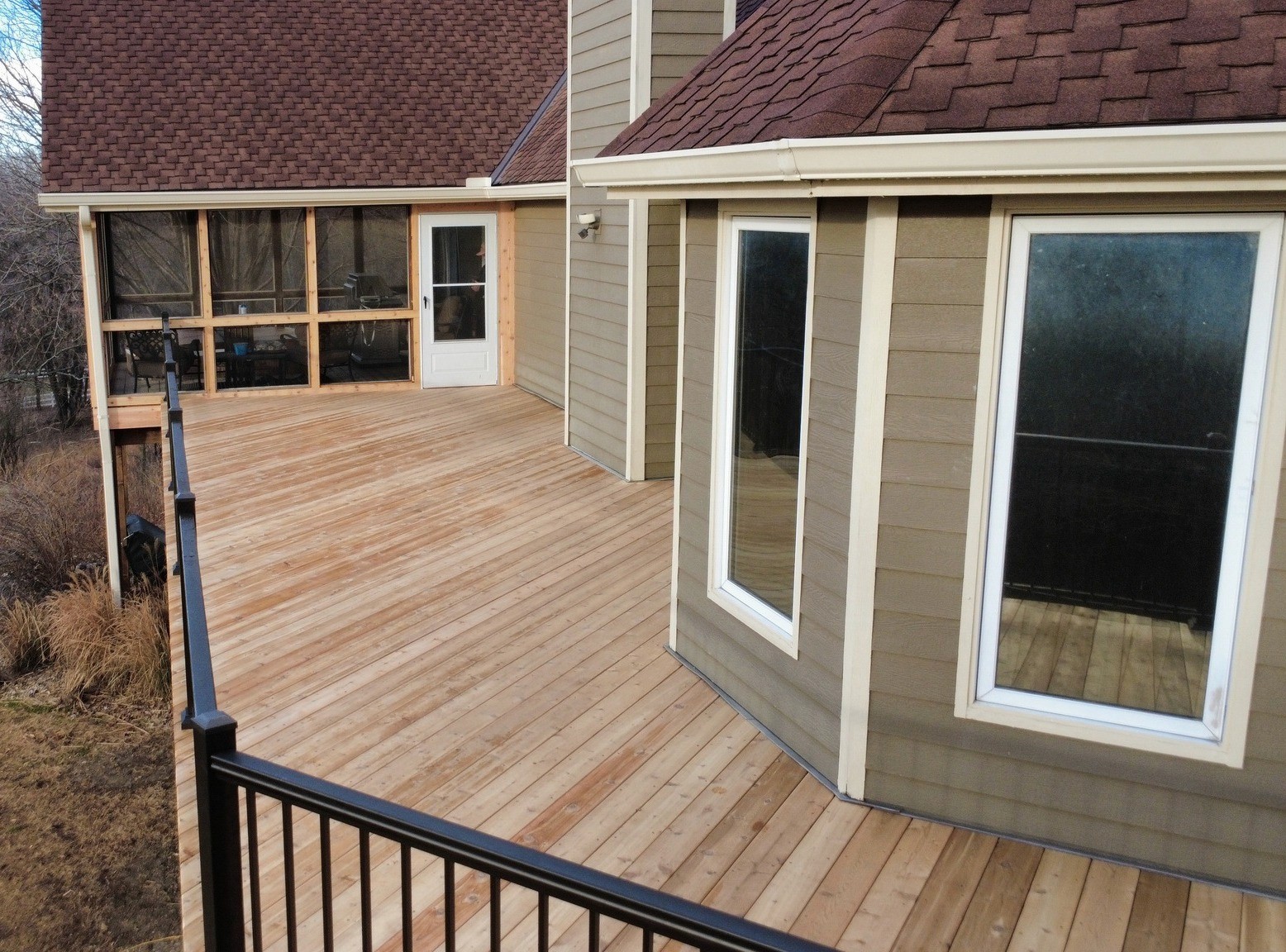 This custom deck upgrade now boasts 825 sq. ft. of living space, featuring Red Cedar decking paired with Bronze Aluminum Railing creating a perfect blend of durability and style.