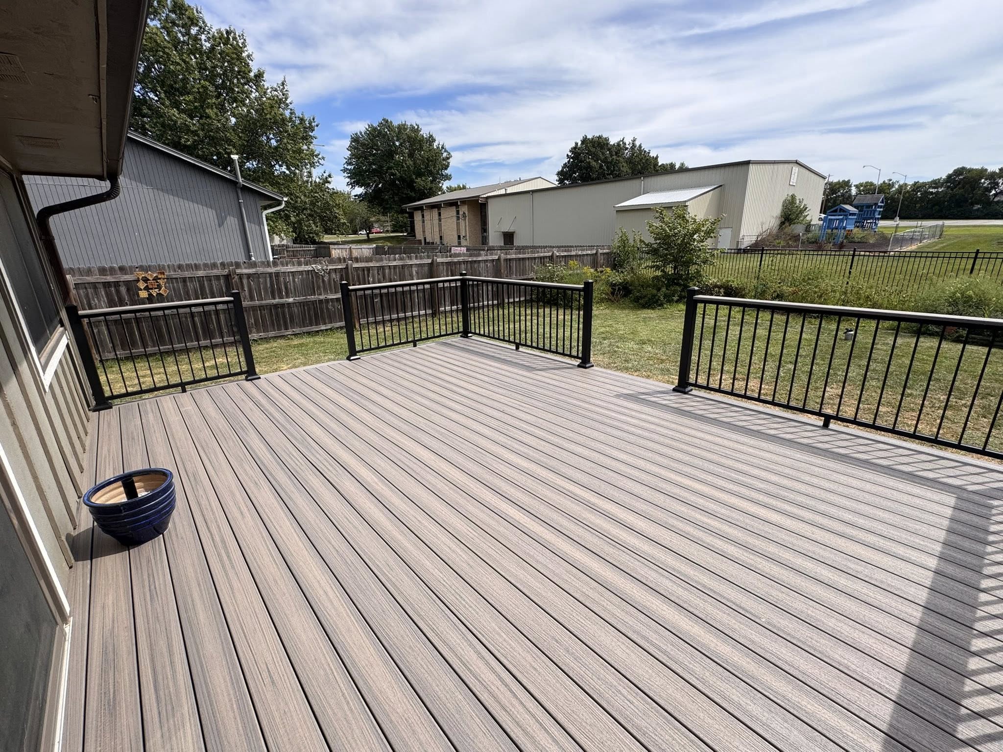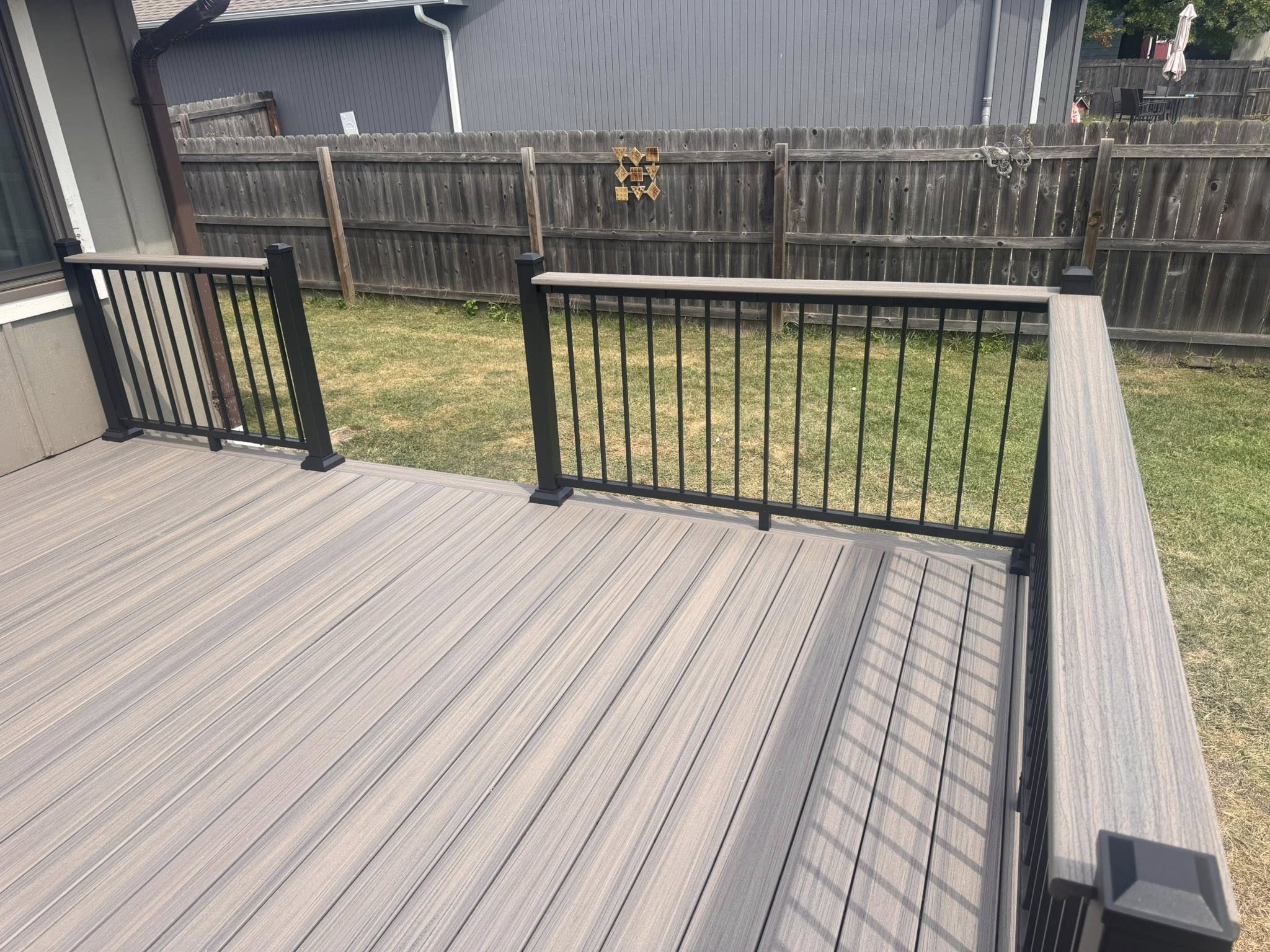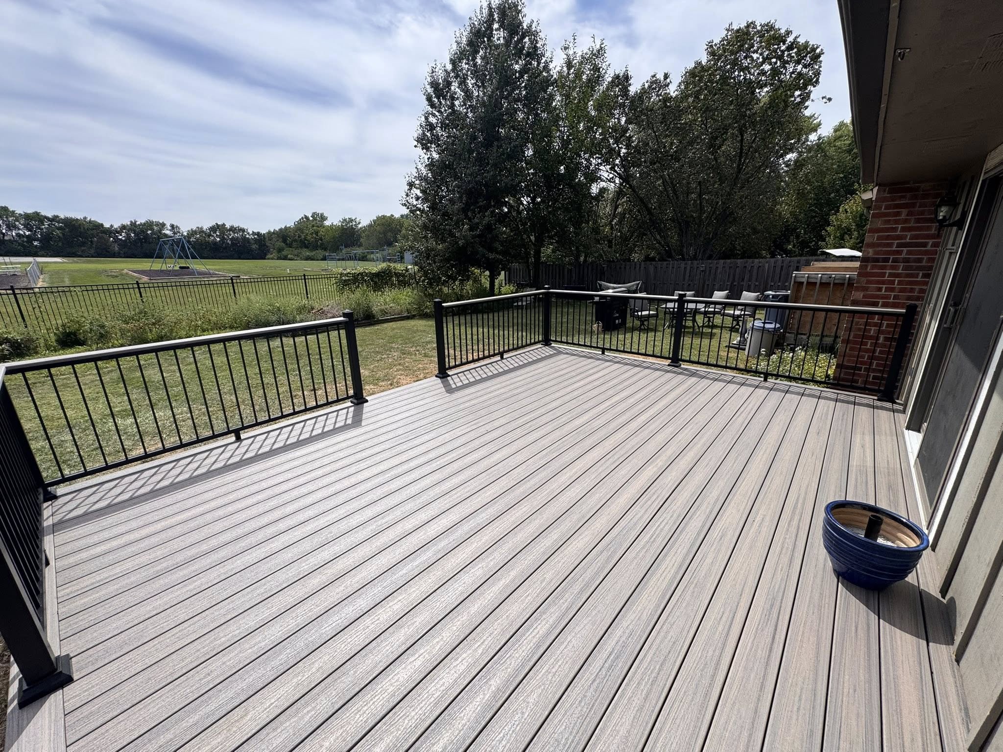 The aluminum railings really give this deck a clean, polished look. This build features “Rocky Harbor” Trex® composite decking paired with the Williams aluminum railing system and matching drink rail, creating a sleek, low‑maintenance outdoor space built to impress.