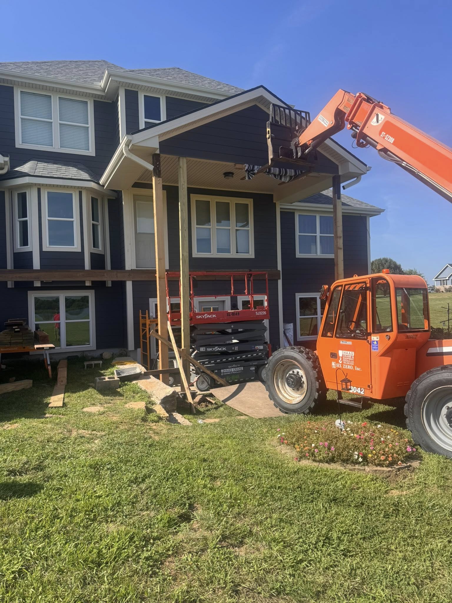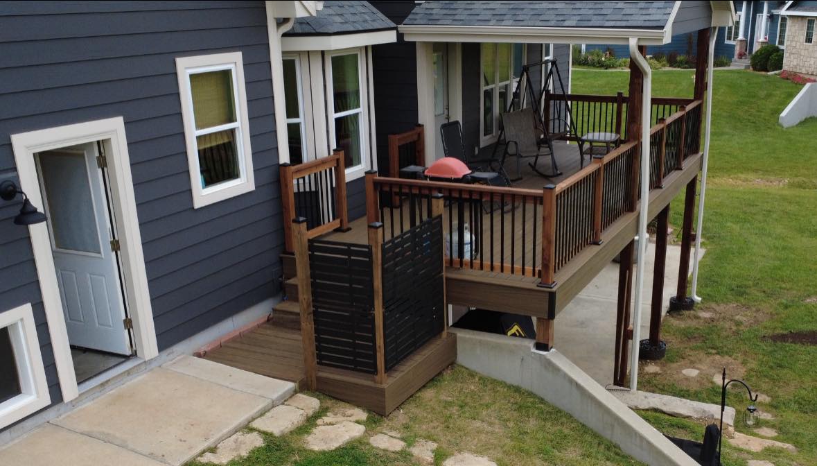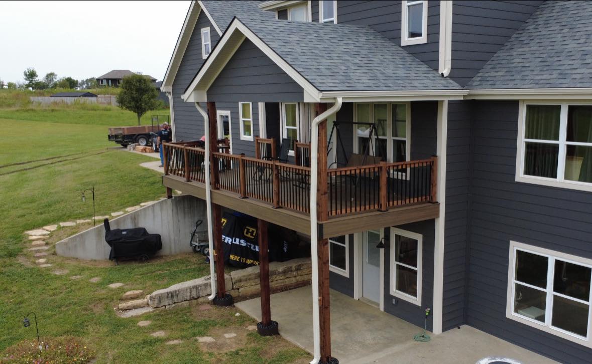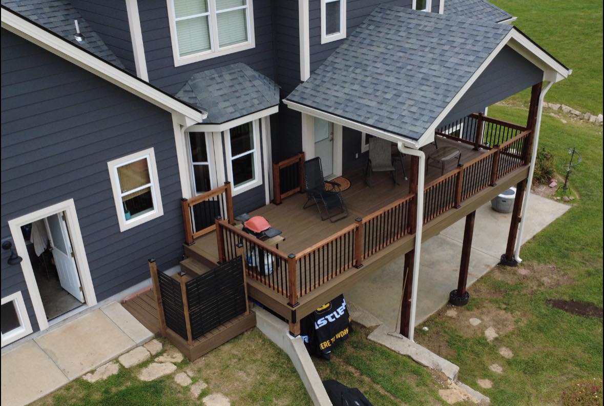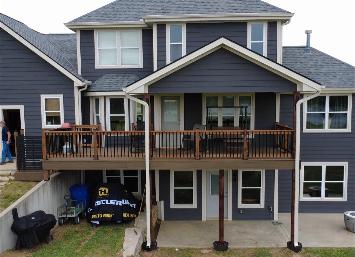 This build came with a few extra challenges, but we loved how it turned out. Before rebuilding the deck, we replaced rotted 6x6 roof support columns that had been buried directly in the ground. We temporarily supported the overhang, poured new above‑grade footers to prevent future rot, and then completed the build with Trex “Toasted Sand” decking and fascia paired with red cedar railings.