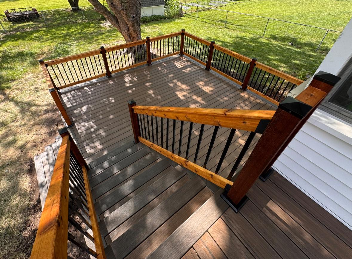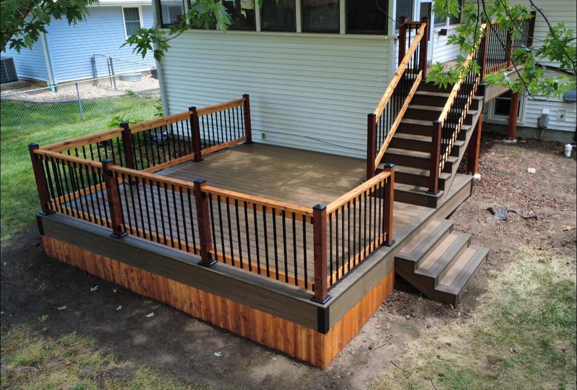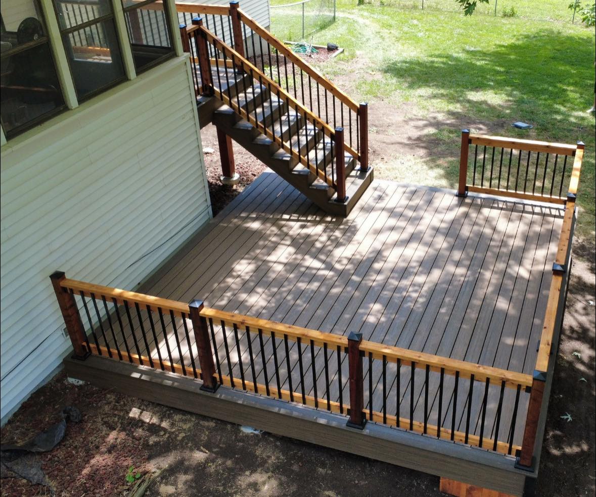 Finished up another build and created the perfect shady spot for the hot summer days ahead. This deck features Trex composite decking in “Toasted Sand” for the main floor, picture‑framed with “Coastal Bluff,” and finished with red cedar railings and skirting for a warm, polished look.
