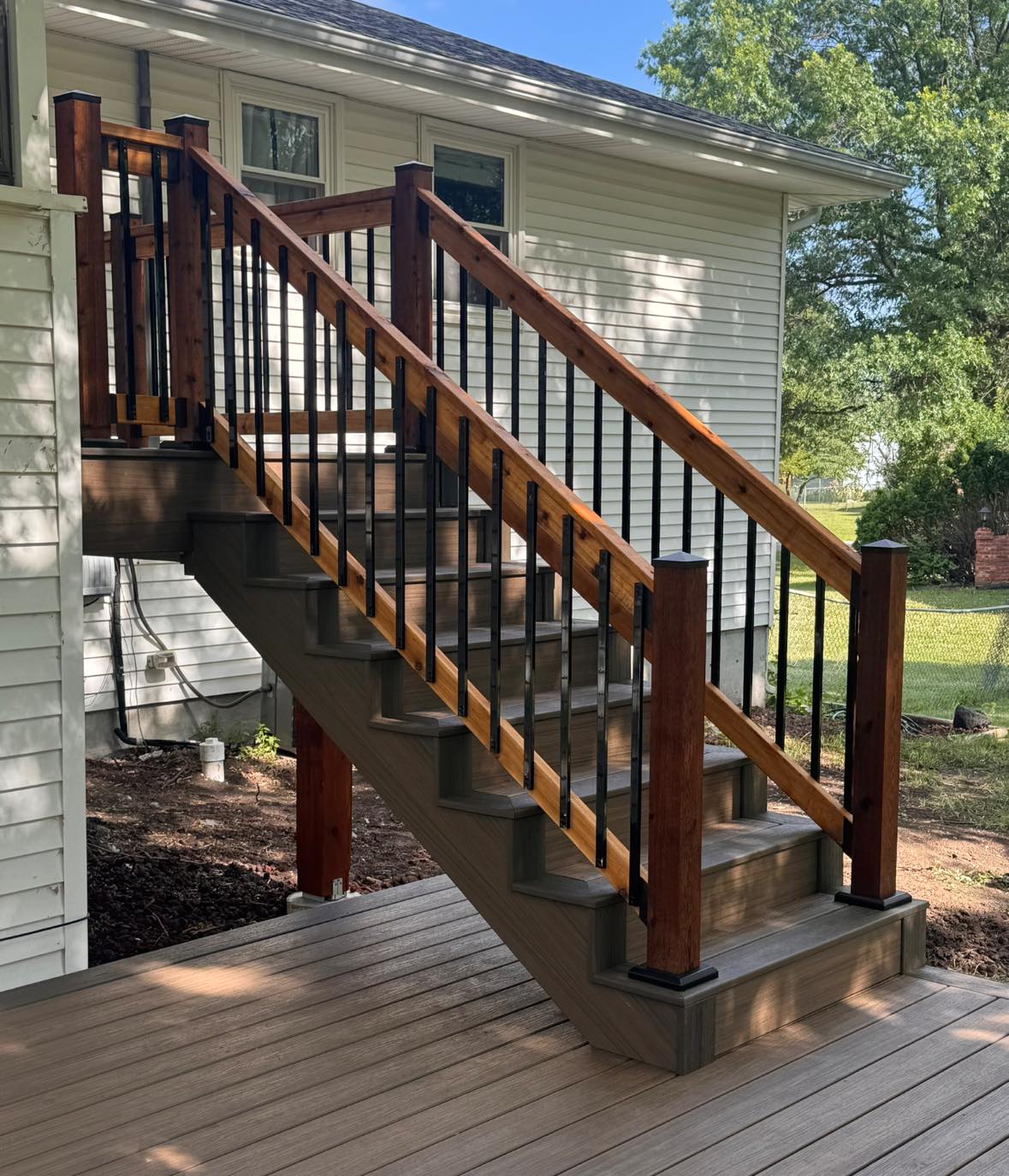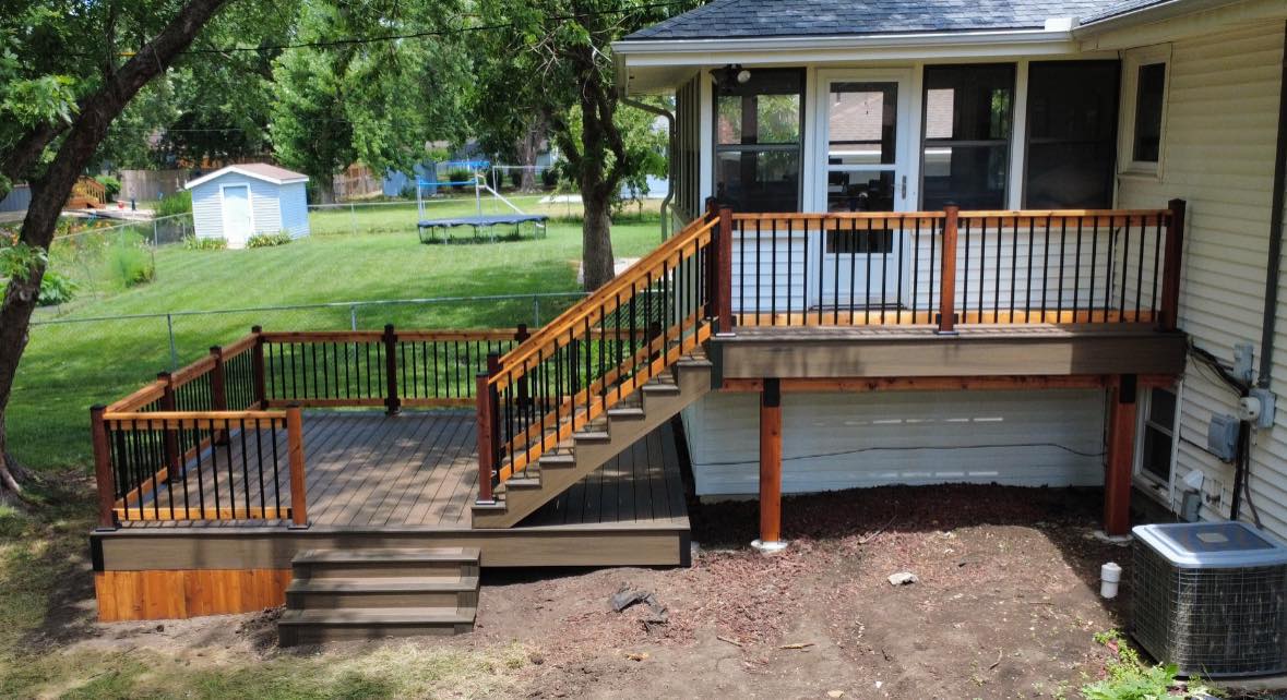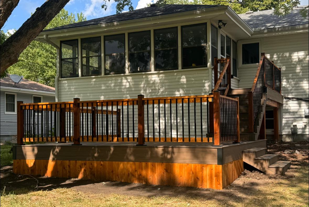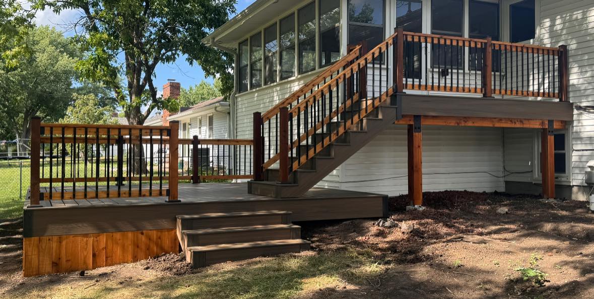 Finished up another build and created the perfect shady spot for the hot summer days ahead. This deck features Trex composite decking in “Toasted Sand” for the main floor, picture‑framed with “Coastal Bluff,” and finished with red cedar railings and skirting for a warm, polished look.